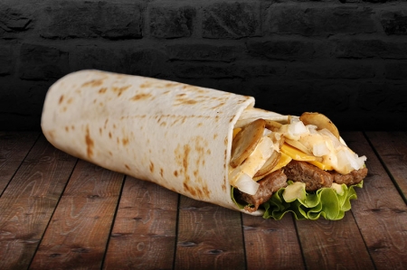 Sjeckani 100% goveđi kosani odrezak od 62,5g u tortilji, sa mexico umakom, svježi luk, svježe narezana salata, gljive sa roštilja, senf + 150 g prženih Mccain fry’n’dip krumpirića sa jednim gratis umakom po izboru + gratis piće po izboru